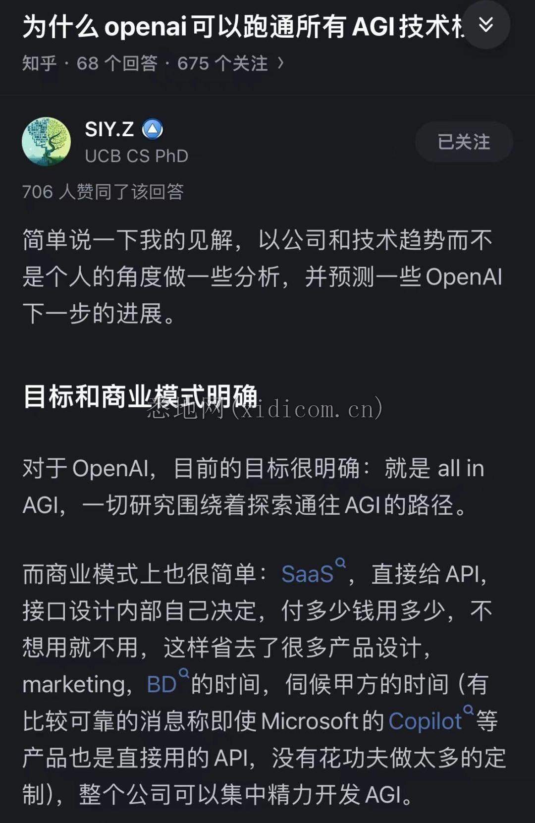 @SIY.Z 总结说,「OpenAI 采取的商业模式以及其对于 AGI 的信奉、系统性的方法论以及积极的尝试,都在推动他们朝着实现通用人工智能的目标前进,实现了一种可以跑通所有 AGI 技术栈的模式,而这一点,是 OpenAI 能在众多研究机构和公司中脱颖而出的重要因素。」详情请参见知乎原贴。