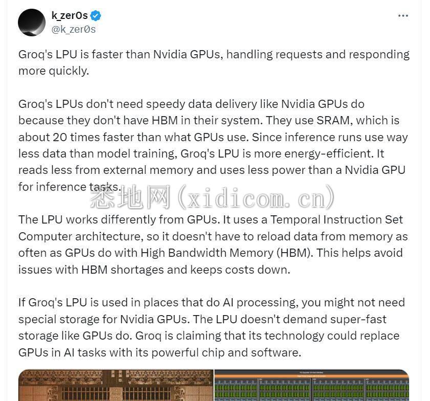 根据twitter网友解释,LPU之所以比GPU快,主要原因在于它使用的存储技术和架构设计。
