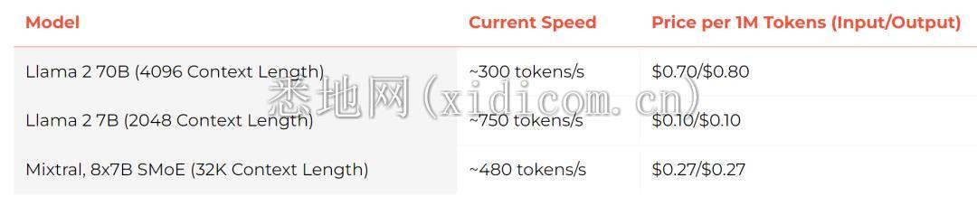 目前Groq支持api接入,一共提供了3个模型,分别是Llama 2 70B、Llama 2 7B 和Mixtral 8x7B SMoE。价格上,Groq也是相当便宜,Llama 2 70B输入和输出价格分别为0.7$/1000k tokens 和 0.8$/1000k tokens。价格方面,Groq保证,一定低于市面上同等价格。