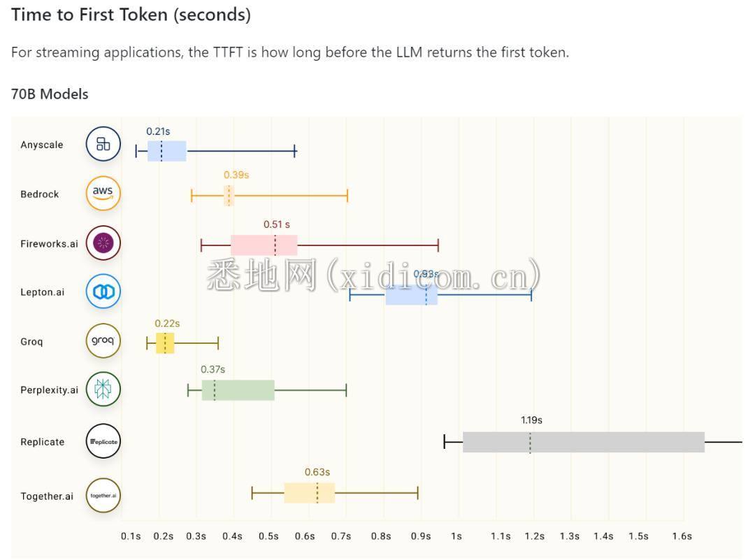 当然,Groq到底有多快,还是要多方比较才能有个完整概念。在github有一个针对70B大模型在不同平台运行速度的测试。可以发现,无论是每秒生成tokens还是响应速度,Groq都是遥遥突出。