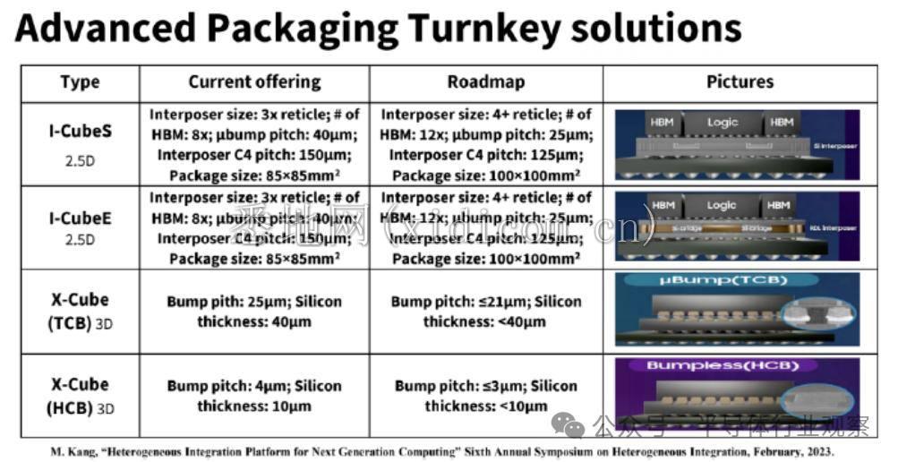 三星在2.5D/3D先进封装技术领域也有布局,并已经推出I-Cube、X-Cube等先进封装技术。针对2.5D封装,三星推出的I-Cube技术可以和台积电的CoWoS技术相媲美。针对3D封装,三星在2020年推出X-Cube技术,将硅晶圆或芯片物理堆叠,并通过硅通孔(TSV)连接,最大程度上缩短了互联长度,在降低功耗的同时提高传输速率。