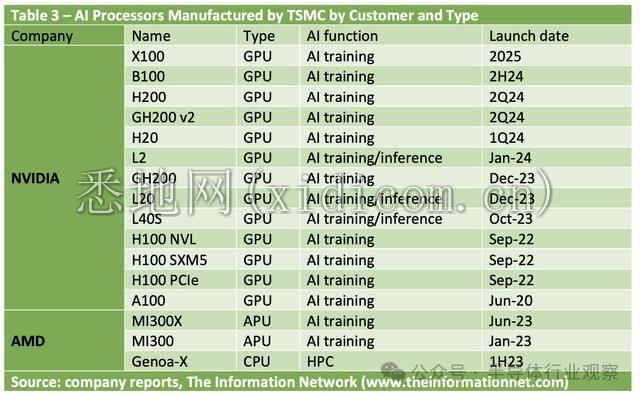 在目前由英伟达和AMD主导的AI训练和推理领域最重要的AI处理器市场中,台积电更是生产了这两家公司的整个芯片组合。