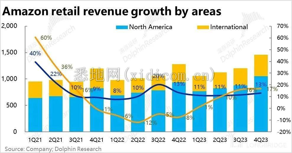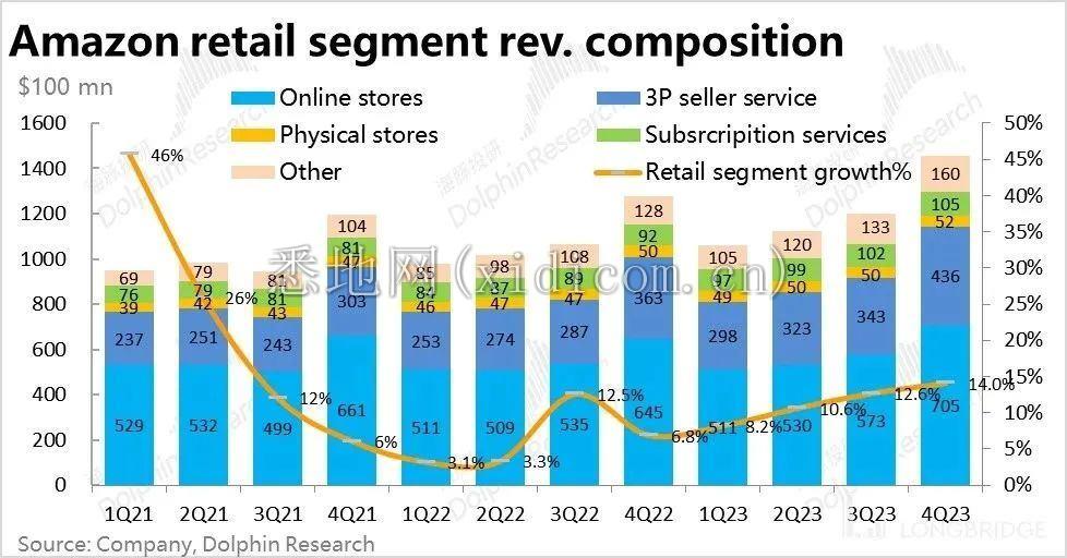 相比云业务的喜中有忧,零售板块的营收和利润表现则是全面超预期的强劲。本季亚马逊的零售板块实现收入 1458 亿美元,同比增速达 14%,较上季度再提速了 1.4pct。