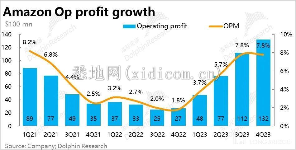 分板块看,AWS 云业务 72 亿的经营利润比预期高了 8%。而北美零售板块的经营利润率更是从 4.9% 环比提升到了 6.1%,已是历史上第二高的水平。