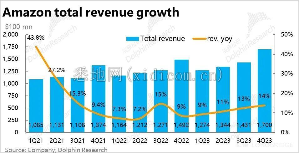 加总云业务和零售业务,亚马逊本季实现总营收约 1700 亿美元,在零售和 AWS 业务增速都有回暖的情况下,总营收增速也提升到了 14%,高于市场预期的 1662 亿。