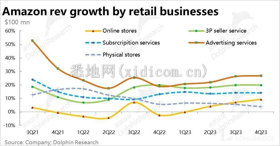 在北美地区小幅仍旧坚韧,而国际地区受益于汇率利好下,零售板块下的各细分业务因此也都出现了增长的反弹。按增速排序,广告业务的增速最高,达到了 26.8%,公司近期也宣布了 Prime Video 上的广告业务,后续仍有增长动力。