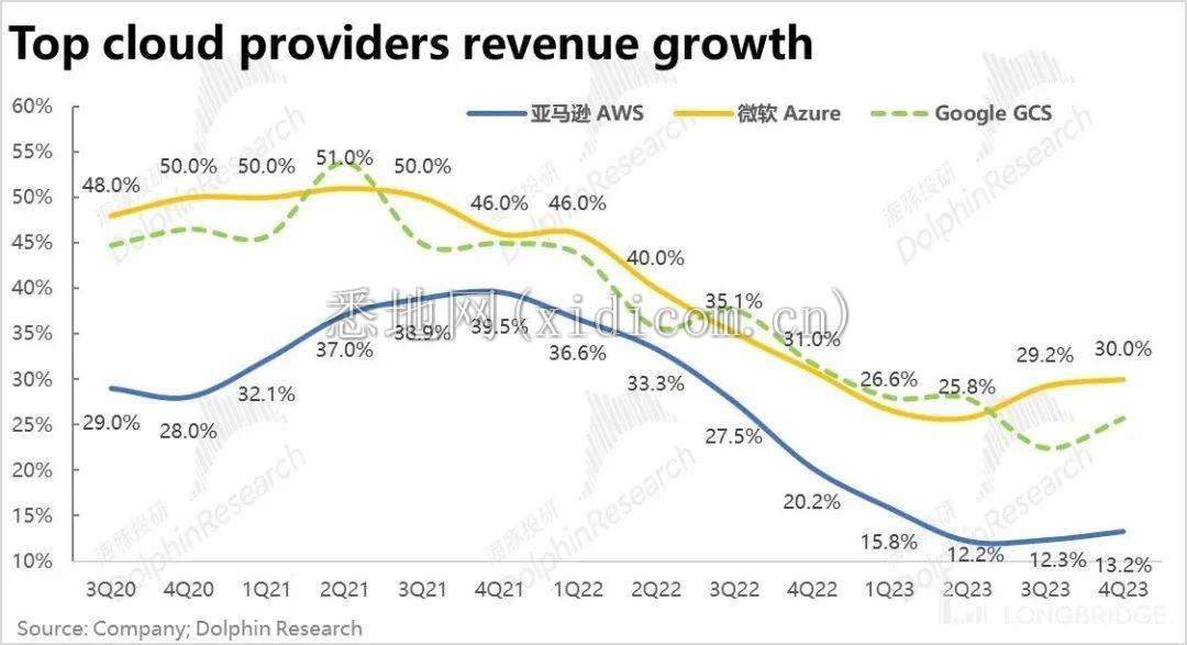 但横向对比美国三大云服务商,可以看到相比 Azure 和 GCS 近两个季度云计算业务明显的提速,AWS 更多只是触底企稳。虽然云计算的整体需求有回暖的预期,但 AWS 在 AI 功能上相对落后的情况下,AWS 持续丢失份额也是市场担忧的关键问题之一。