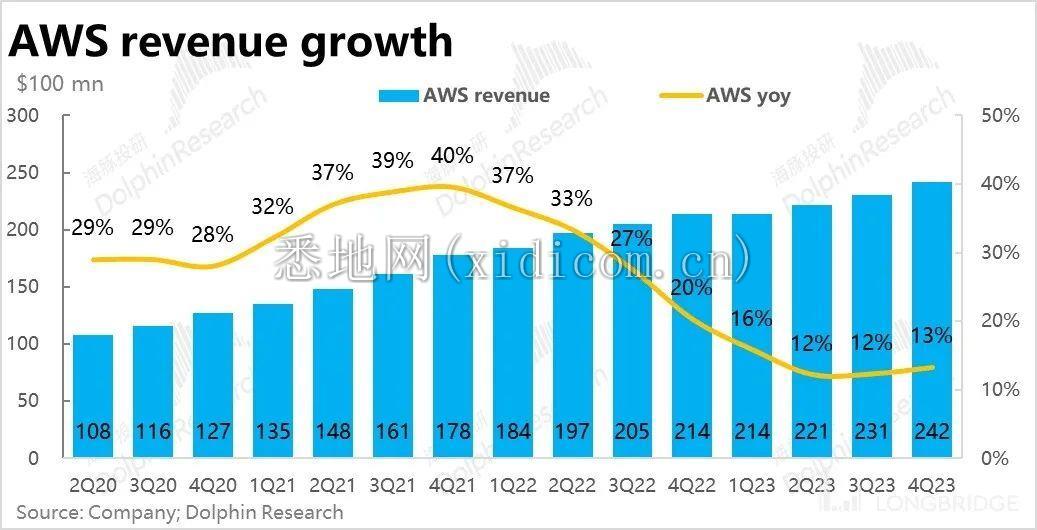 本季度 AWS 收入 242 亿美元,增速环比略微提升到约 13%,和市场预期基本完全一致。由于欧美企业 IT 支出优化周期退潮,和 AI 投入带来的增量需求,市场也普遍预期 AWS 的增速会开始回暖。