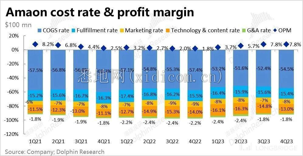 而研发和内容支出的下降则非常显著,是利润改善的最大贡献之一。费用率同比、环比分别收缩了 1pct 和 1.8pct,下降幅度非常可观。海豚投研认为,公司在 AWS 和在线影音业务上裁撤工程师、销售人员,以及投入的减少应当是费用下滑的主要原因。
