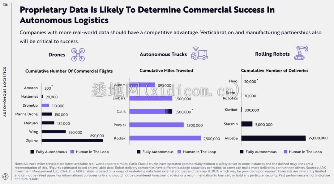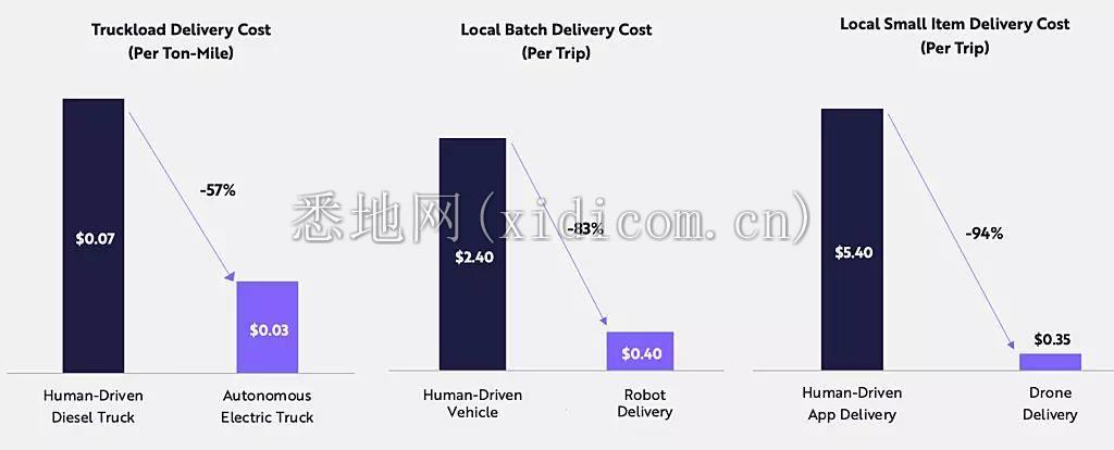 在自主物流部分,ARK 认为,自动化释放巨大潜力的另一个领域在于它可以降低成本和改变供应链。报告称:“未来 5 到 10 年内,自主物流应将货物运输成本降低 15 倍。”“自动驾驶无人机和机器人已经完成了数百万次送货,而自动驾驶卡车运输公司已经行驶了数千万英里,并开始取消安全驾驶员。”