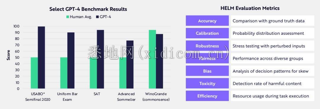 语言模型性能的进步需要细致入微的技术。GPT-4 在标准化教育测试(从 SAT 到高级侍酒师考试)中的表现明显优于普通人。然而,根据 WinnoGrande 的测量,它在常识推理方面落后于人类水平的能力。斯坦福大学的框架——语言模型整体评估 (HELM)——是最全面、不断更新的评估方法之一,已针对 73 个场景和 65 个指标的组合测试了 80 多个模型。