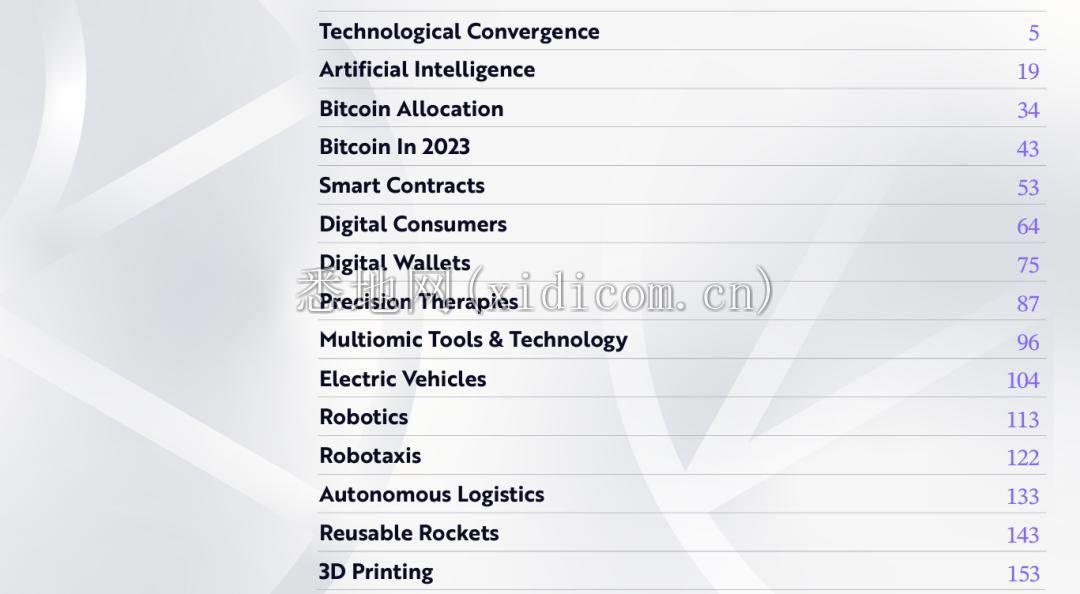 过去几年,方舟投资表现抢眼,成为全球最受欢迎的主动管理基金之一。ARK 创始人“木头姐”( Cathie Duddy Wood )素有“科技股女神”、“女巴菲特”美誉,其独特投资理念也吸引了大批投资者和合作伙伴,包括埃隆·马斯克、前 Twitter CEO 杰克·多西等业界巨擘。方舟投资采取开放透明的策略,每日公布持仓变动,还定期发布《Big Ideas》报告,分享对未来技术趋势的深刻见解。2024 年《 Big ideas 》有 160 多页,章节标题包括技术融合、AI、2023 年比特币、数字钱包、精准疗法、可重复使用火箭和 3D 打印等。篇幅有限,我们挑选出技术融合、AI、机器人三大主题和相关亮点,以飨读者。