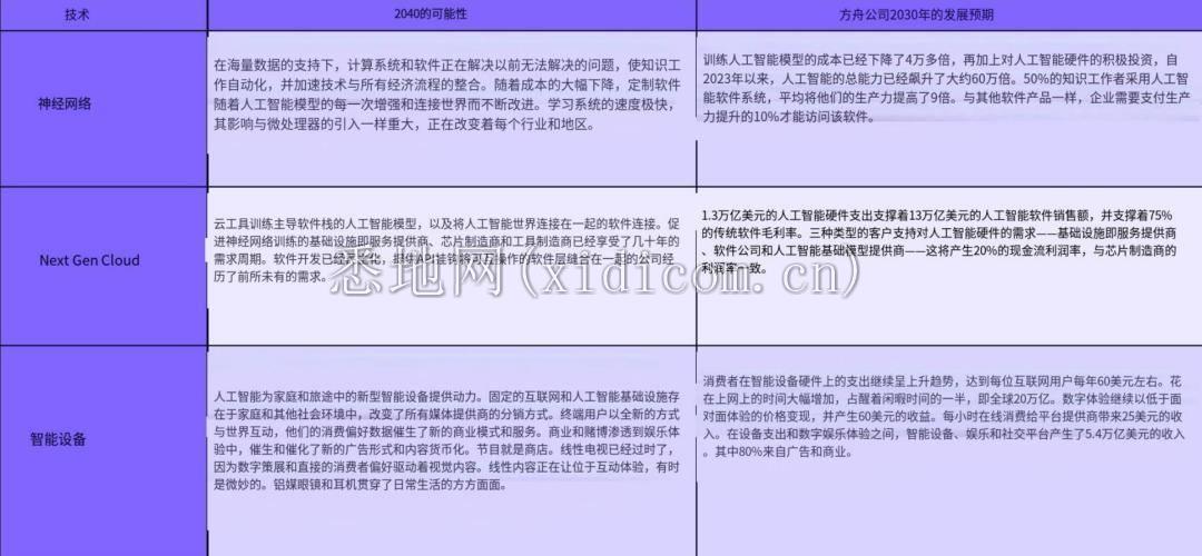 AI 包括神经网络、下一代云技术以及智能设备三个部分,报告分别预测了2030年、2040年的发展趋势。
