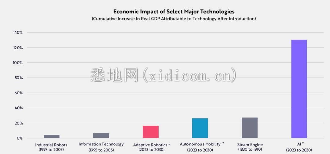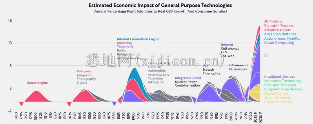 下图显示出蒸汽机、铁路与电报等技术、电力与电话、电台等通用技术对经济产生的影响(时间和幅度)。如今,AI、机器人等颠覆性技术融合正在掀起历史性技术浪潮,对经济的影响也将超过之前的通用技术。