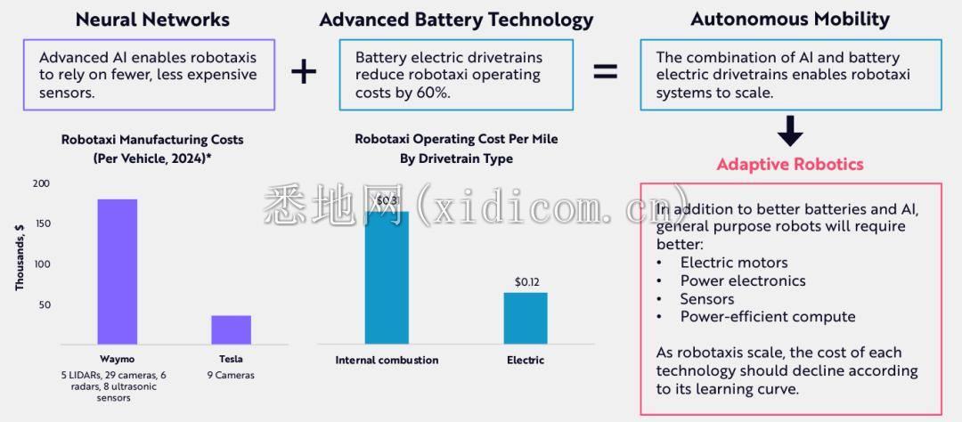 单个颠覆性技术进步合并起来,可以级联成巨大的新市场机会。比如,神经网络+电池技术,可以促使自主移动设备(比如自动驾驶出租车)的规模化。除了更好的电池和 AI,通用机器人还需要更好马达、传感器等其他部件。随着自动驾驶出租车规模化,这些技术成本也会下降,带来通用机器人市场的巨大机会。