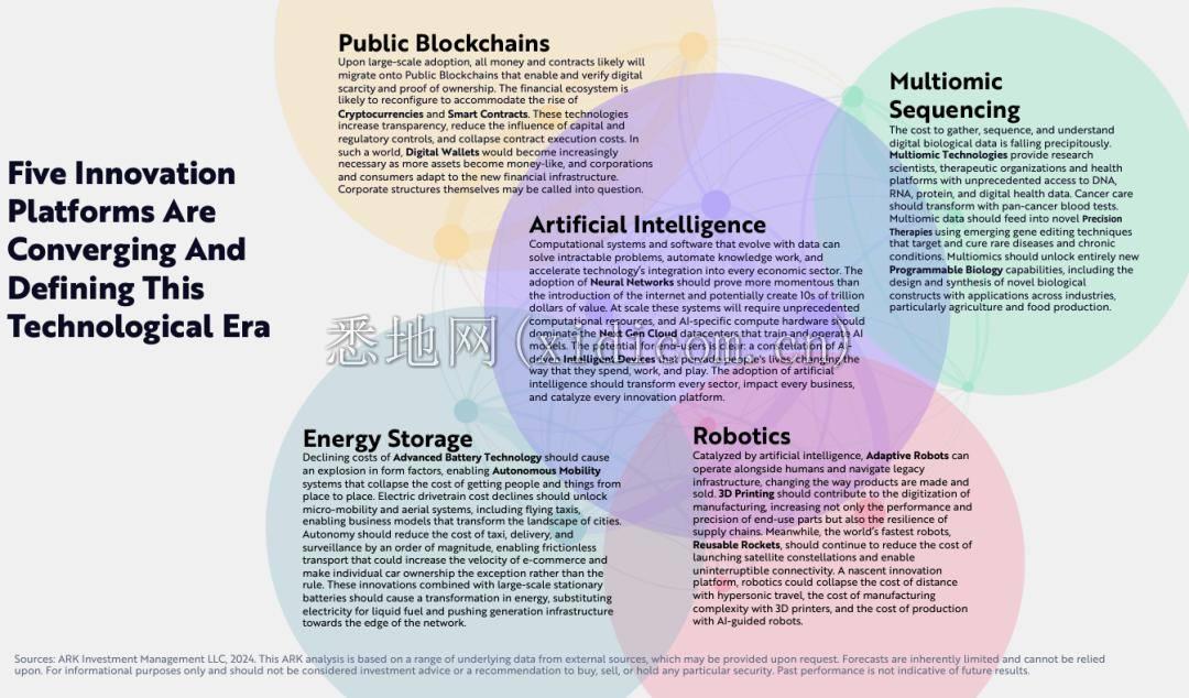作为一家专注投资颠覆性创新( Disruptive Innovation )的公司,ARK 主要投资AI、区块链、储能、机器人等技术。他们认为,这些领域将改变世界的运作方式,同时也创造了长期的投资机会。