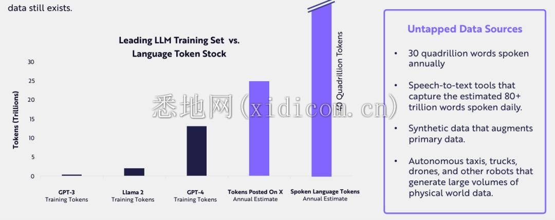 LLM 是否会耗尽数据,从而限制其绩效?计算能力和高质量的训练数据似乎是模型性能的主要贡献者。模型的增长需要更多训练数据,缺乏新数据是否会导致模型性能趋于稳定?Epoch AI 估计,书籍和科学论文等高质量语言/数据源可能会在 2024 年耗尽,尽管仍有大量未开发的视觉数据。