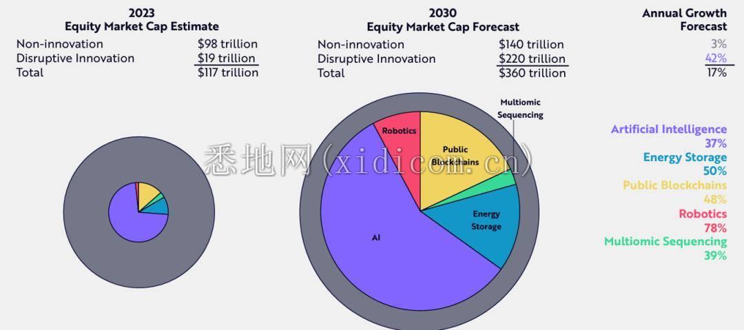 根据 ARK 的研究,颠覆性技术的融合将定义下一个十年。五个主要技术平台—— AI 、公共区块链、多组学测序( Multiomic Sequencing )、能源存储和机器人——正在融合,应该会改变全球经济活动。技术融合可能会带来比第一次和第二次工业革命更具影响力的宏观经济结构转变。在全球范围内,随着机器人重振制造业、机器人出租车改变交通运输、AI 提高知识工人的生产力,实际经济增长可能从过去 125 年的平均 3% 加速到未来 7 年的 7% 以上。在 AI 突破的推动下,到 2030 年,与颠覆性创新相关的全球股票市场价值可能会从总市值的 16% 增加到 60% 以上。因此,与颠覆性创新相关的年化股票回报率可能会在 2030 年超过 40%。未来七年,其市值将从目前的约 19 万亿美元增加到 2030 年的约 220 万亿美元。