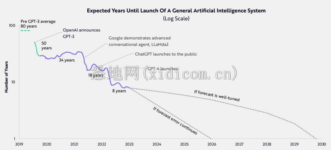 报告指出,AI 的发展速度也快于预测者的预期。2019 年预测通用 AI 出现要等 80 年,随着 GPT-3 等技术相继登上历史舞台,预测的时间也从 80 年减少到 50 年、 34 年。GPT-4 出现后,预期时间甚至缩短到了 8 年。下图显示,通用 AI 有可能在 2026 年出现(慢则 2030 年。)