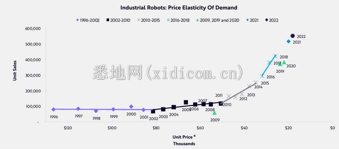 较低的价格刺激了对工业机器人的需求。产量每翻一番,工业机器人成本就会下降50% 。