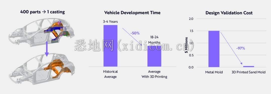 另外,得益于 3D 打印技术,汽车生产进入了一个前所未有的领域。据媒体报道,特斯拉正在试验用 3D 打印砂模铸造汽车底盘,可以用一个零件替代 400 个零件,从而分别降低 50%和 97%的汽车 开发时间表和模具设计验证成本。3D 打印可以在每一辆汽车的生产中发挥作用。