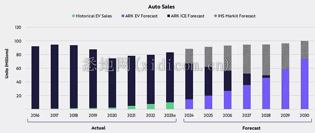 在电动汽车部分,ARK 报告多次引用赖特定律,在电动汽车的背景下,电池成本正在下降,压低汽车的价格。这是 ARK 预计全球电动汽车销量将增长 33% 的重要原因,从 2023 年的约 1000 万辆增至 2030 年的 7400 万辆。“如果电动汽车继续获得市场份额(正如我们相信的那样),那么,二手车和新型电动汽车将比新型内燃机 ( ICE ) 汽车更具经济意义,这可能会给现有汽车制造商带来死亡螺旋。”报告写道。那么,RIP,内燃机汽车。