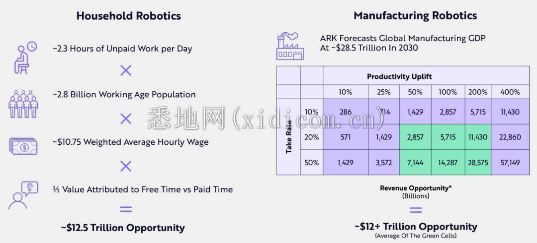 通用机器人代表着全球价值 24 万亿美元以上的潜在收入机会,包括家用机器人和制造机器人。ARK 预测,2030 年全球制造业 GDP 将飙升至 28.5 万亿美元。
