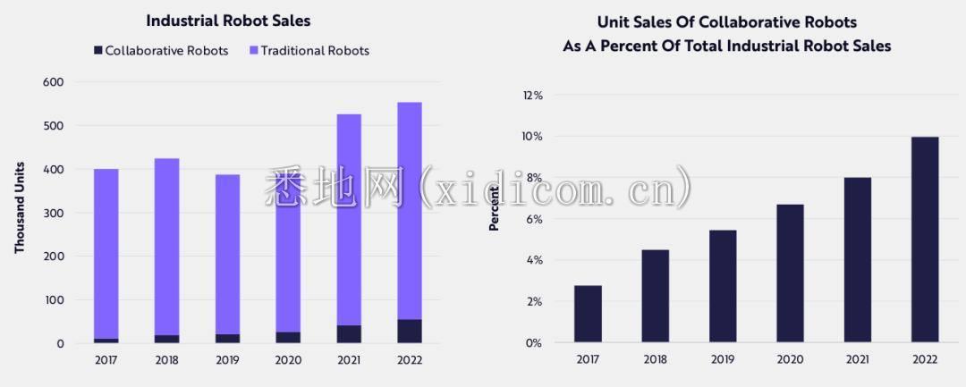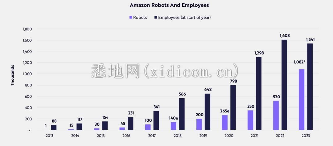 许多公司将部署比人类员工更多的机器人,将他们从沉重的体力劳动中解放出来。下面是亚马逊部署机器人和人类员工的对比,机器人数量可谓奋起直追,并在 2023 年达到总量的历史最高点,与人类员工相差不多了。