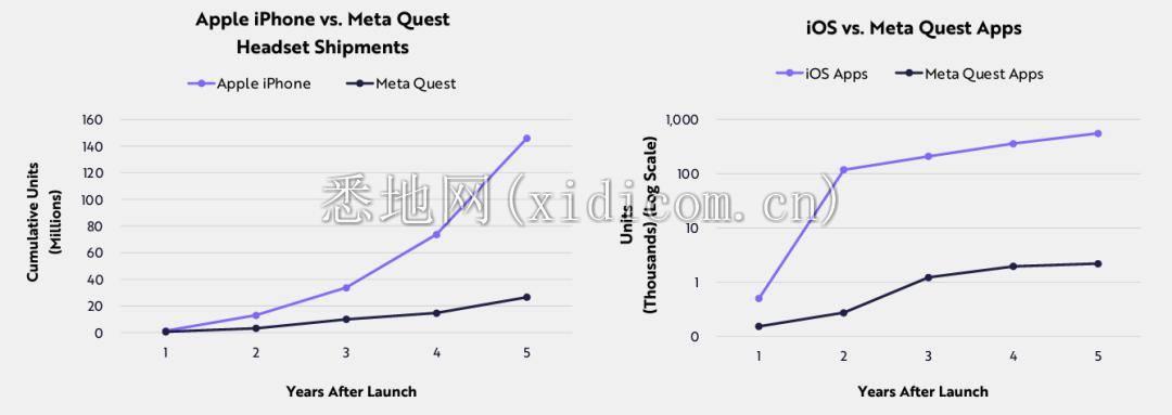 虚拟现实市场刚刚起步。尽管头显设备有了重大改进,包括苹果的 Vision Pro,但开发人员并没有蜂拥而至支持虚拟现实 (VR)。如果没有令人信服的用例,采用速度很慢。例如,MetaQuest 仅提供 2,200 个应用程序,而 iPhone 推出五年后拥有 553,000 个应用程序,而这只是其中的一小部分。结果,Meta 仅售出了 2700 万部 Quest,仅占苹果发布五年后累计售出 1.46 亿部 iPhone 的 18%。