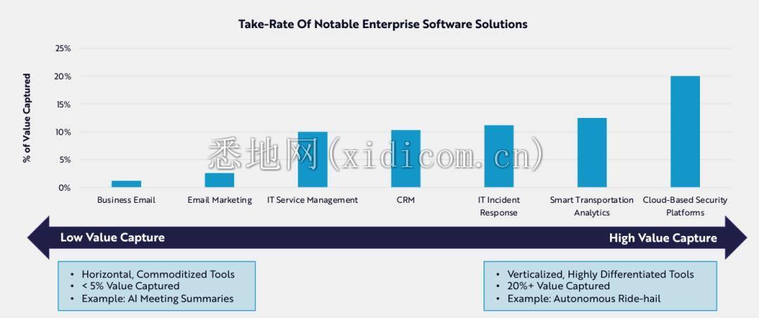 微软 CEO 纳德拉最近针对微软财报首次提到,依据价值贡献为提高生产力的AI功能定价的潜力。报告也指出,定制化 AI 产品应享有更多定价权。随着开源替代品的出现和成本的下降,针对最终用途定制的AI软件供应商应该能更容易地通过它们获利。相反,简单的生成式 AI 应用程序可能会迅速商品化。