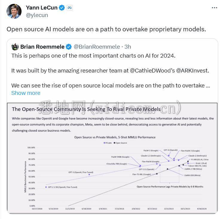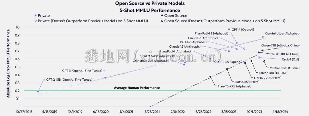 下面这张图是不是很眼熟?报告指出,开源社区正在与私有模型竞争。开源社区及其领军企业 Meta 正在挑战 OpenAI 和谷歌的闭源模型,使生成式 AI 的访问民主化。总的来说,在最近来自中国的模型帮助下,开源模型的性能比闭源模型的性能提高得更快。