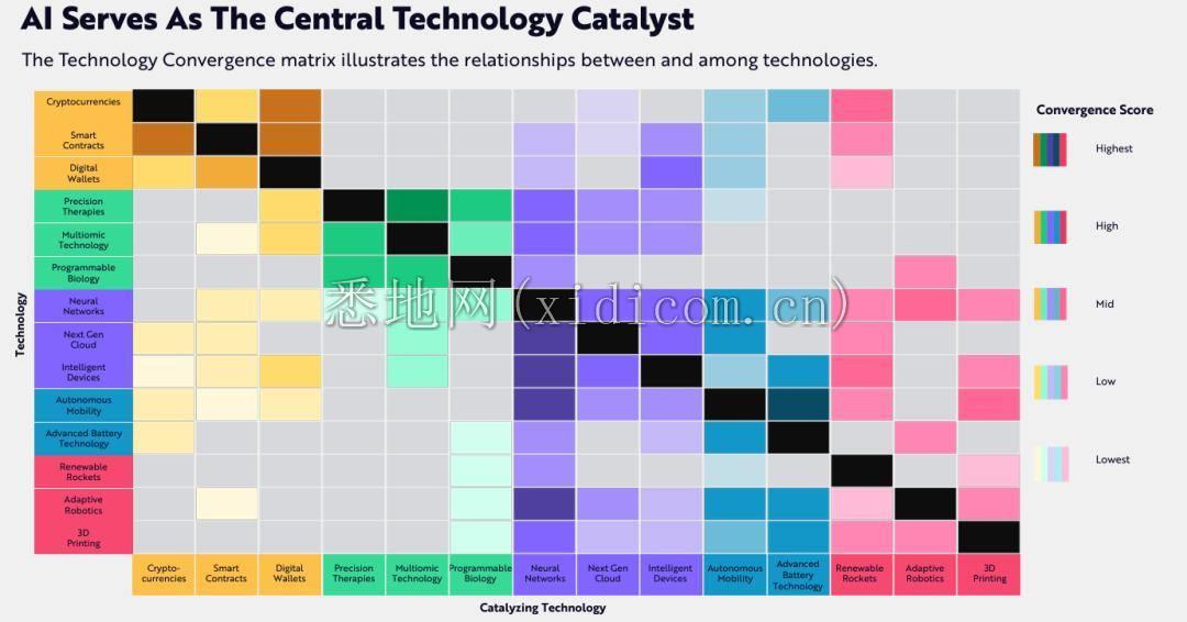 这些颠覆性技术彼此之间也会相互融合与影响。 如下图,有的技术融合度非常高(比如 AI),有的比较低。 AI(紫色部分)展现出核心技术催化剂的地位和作用。