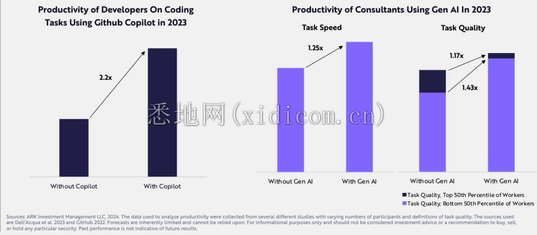 AI 已经显着提高了生产力。GitHub Copilot 和 Replit AI 等编码助手是早期的成功案例,它们提高了软件开发人员的生产力和工作满意度。AI 助理正在提高知识工作者的绩效,有趣的是,相对于高绩效员工,绩效不佳的员工受益更多。