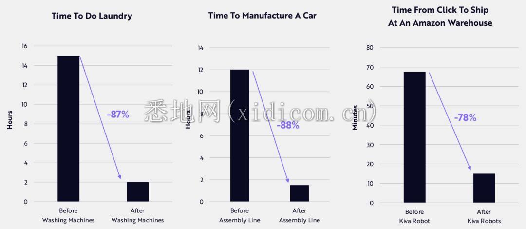 自动化对产能影响巨大,将变革许多行业。最右边是亚马逊仓库,从你点击下单到商品装运,以分钟计算,时间缩短了78%。