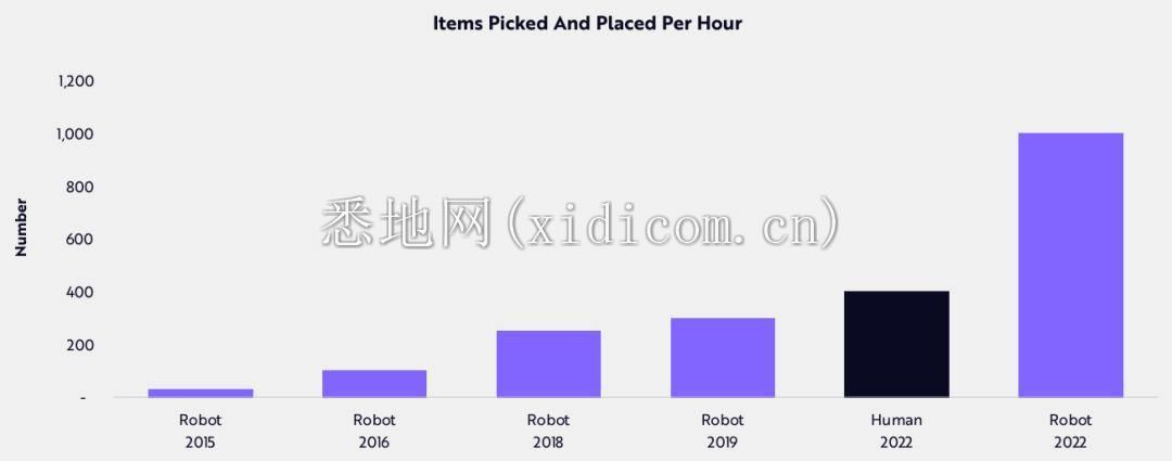 性能的提高正在刺激对工业机器人的需求。计算机视觉和深度学习的进步使机器人性能在七年内提高了 33 倍。机器人的表现已经超过人类两倍以上,目前尚不清楚上限在哪里。这是不同机器人每小时采摘和放置的物品的变化趋势图: