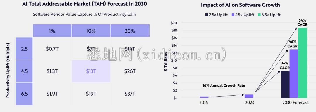 加速知识工作者生产力的增长,代表着数万亿美元的潜在机会。到 2030 年,AI有潜力使知识型职业中的大多数任务实现自动化,大幅提高普通员工的生产力。自动化和加速知识工作任务的软件解决方案应该是主要受益者。如果新一波 AI 创新者拥有与今天类似的定价能力,并且 AI 生产力的提升与我们想象的一样有意义,那么,到这个十年末,全球软件市场可能会增长 10 倍。