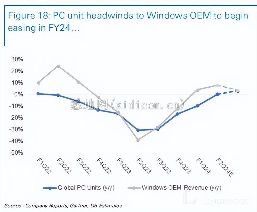 3. 剔除收购,看似光鲜的个人计算板块只是企稳:板块的名义营收同比增速达到了 19%,提升幅度较大。但一方面因为去年同期基数极低(当时增速-18%),另一方面又并表暴雪的影响。剔除这部分影响,可比增速实际为 4.3% 左右,较上季只是略有改善。实际情况更多是 PC 出货量触底企稳后,公司个人业务板块同样趋于稳定。