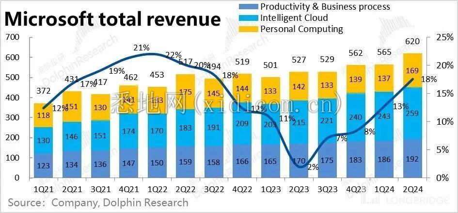 整体来看,微软本季实现营收 620 亿美元,略高于市场预期 611 的亿,名义增速从上季的 13% 提升到近 18%。不过剔除并表动视暴雪贡献的 20 亿收入后,实际可比增速约为 13.6%,较上季略有提升。