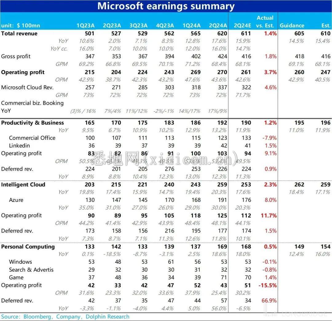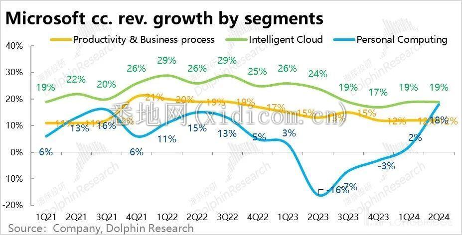 总的来看,从微软本季的绝对表现来看,营收速继续环比略有提高(不计并表影响),而利润同比提升超 30% 的表现并不错。
