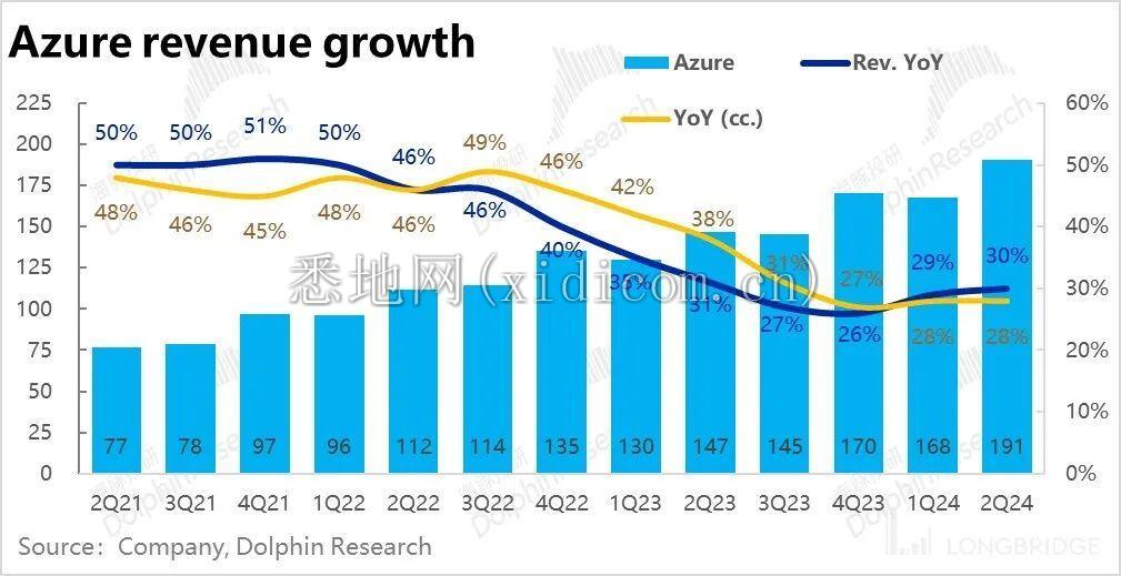 智慧云板块的拳头产品 Azure,本季实现营收 191 亿美元,继续创历史新高,名义同比增速环比提升了 1pct 到 30%,剔除汇率影响后则是维持在 28%。