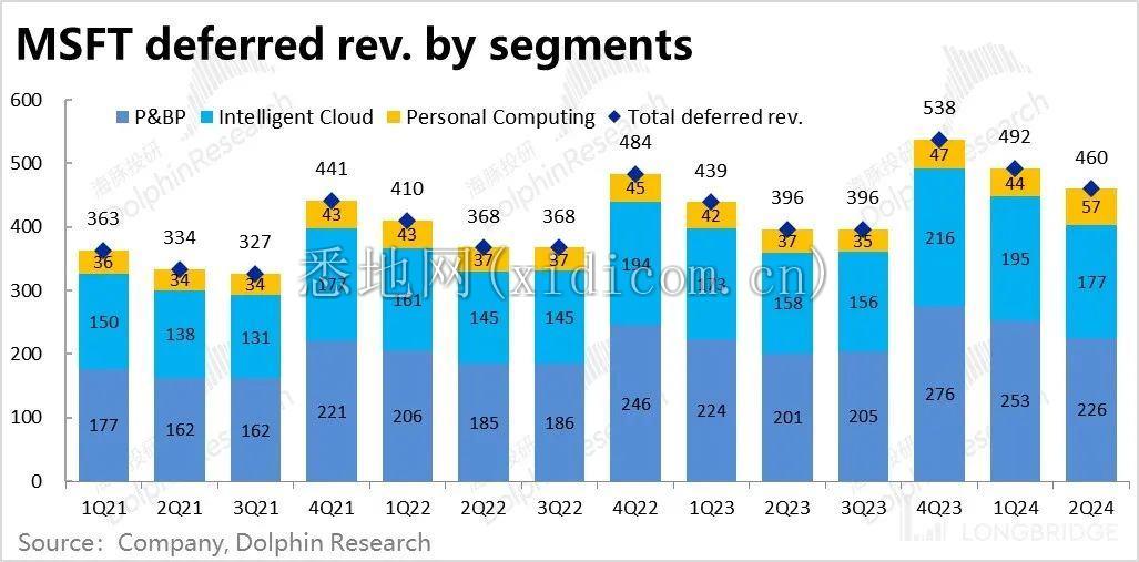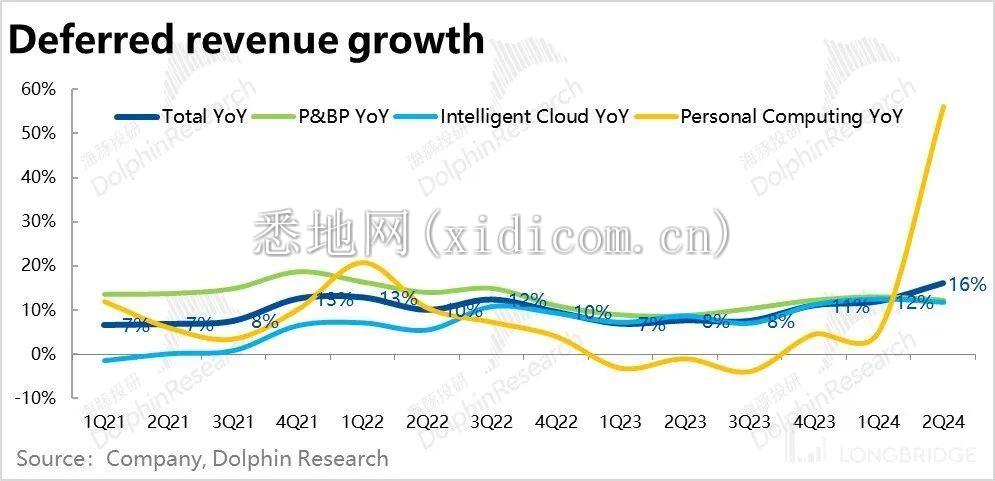 细分来看的话,智慧云和生产力流程板块递延收入的同比增速都为 12%,相比上季度都环比下滑了 1pct。而个人计算板块则因并表影响,递延收入同比增长了 56%。