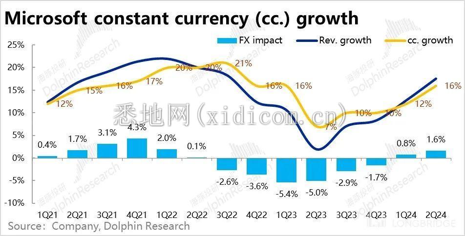 综上所述,微软当季 Azure 和 Office 365 这些核心业务,以及生产力和智慧云大板块的营收,在剔除汇率影响后,要么是边际略有下滑 1-2pct,要么是环比持平,并未继续提速。