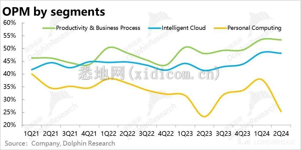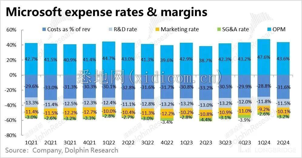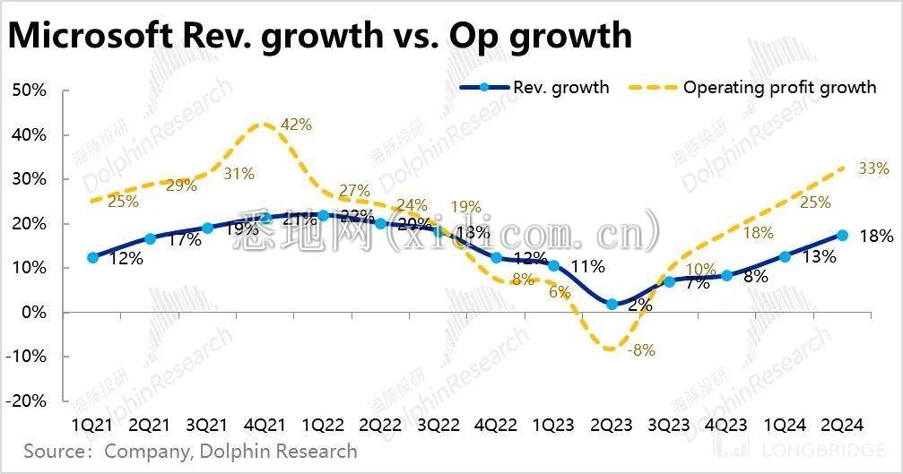 5. 控费比增效贡献了更多的利润:相比营收层面多项指标增速普遍出现了边际在下滑的迹象,微软本季的利润表现还是可圈可点,主要是经营利润率同比提升了近 4.9pct。