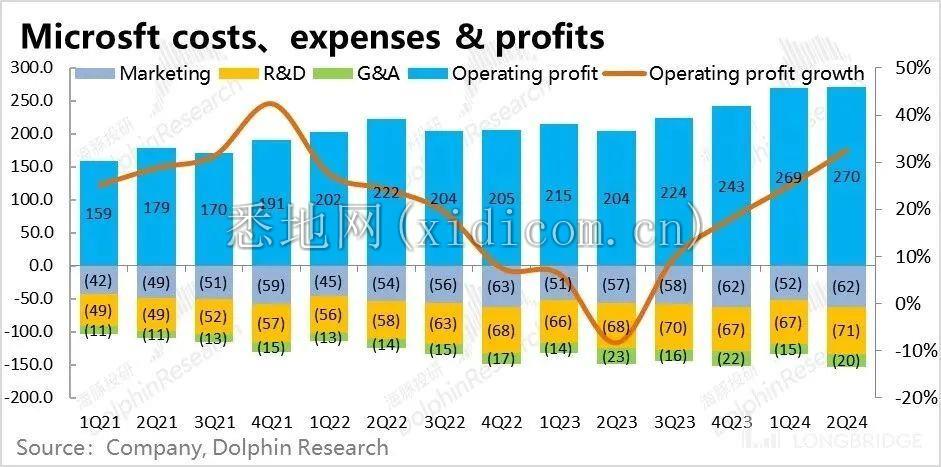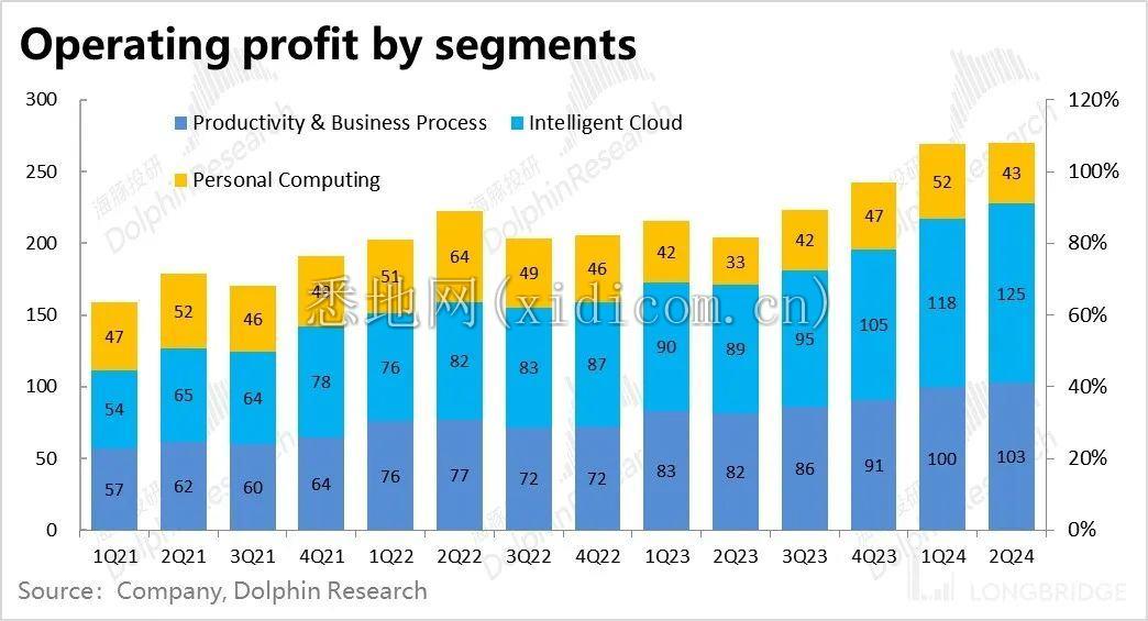 3)最终微软本季的经营利润达到了 270 亿美元,同比增幅达到 33%。虽然增速看似很高,但主要是去年低基数的影响。从利润的绝对额来看,在营收环比增加了近 55 亿的情况下,利润仅增加了约 1 亿。