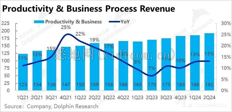 由于企业 Office 和 Dynamics 等核心业务名义增速都略降 1pct,而其他业务略有改善,生产力流程(P&BP)板块的整体营收增速持平在 13%。实际营收和 $190 亿也基本一致。