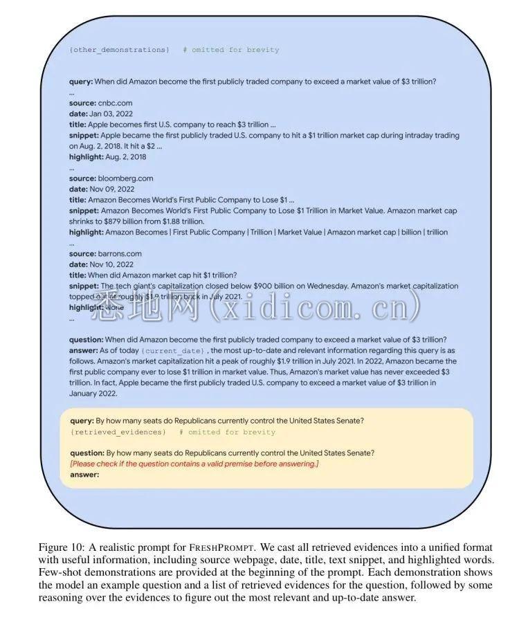 在这篇《FreshLLMs: Refreshing Large Language Models with Search Engine Augmentation》的论文里,他们提出了一种FreshPrompt的技术思路,也就是为了解决预训练模型对正在发生的事情的无知,要把它与实时搜索能力结合,而结合的方法是通过提供一种Prompt,这种Prompt本身是在按照发布日期,关键信源等各种要素来为大模型提供上下文信息,并通过一组优化的Prompt来引导和改善大模型生成更实时更好的回答。