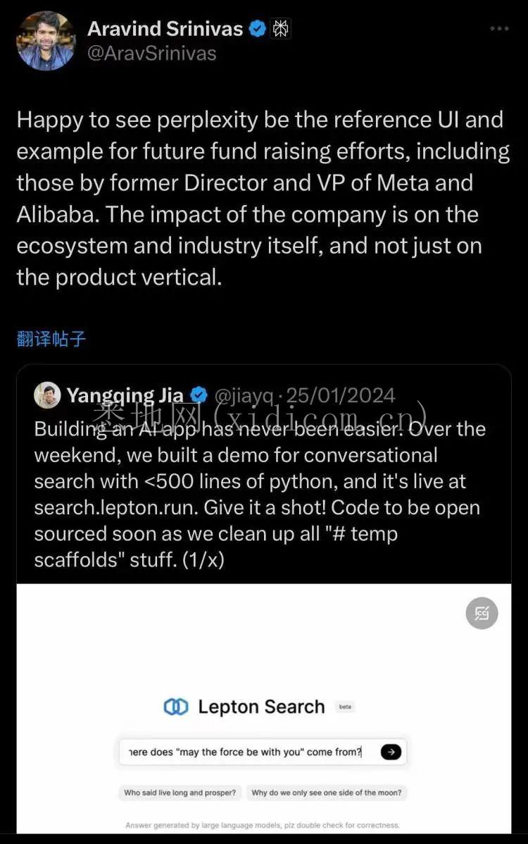 翻译过来就一句话:Lepton为了融资而抄了我Perplexity尊贵的前端代码。