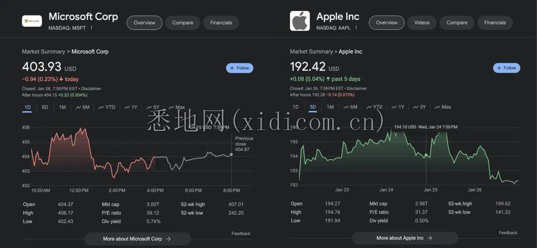 截止 1 月 26 日收盘,苹果已经跌落 3 万亿美元以下,而微软则继续保持在 3 万亿美元。