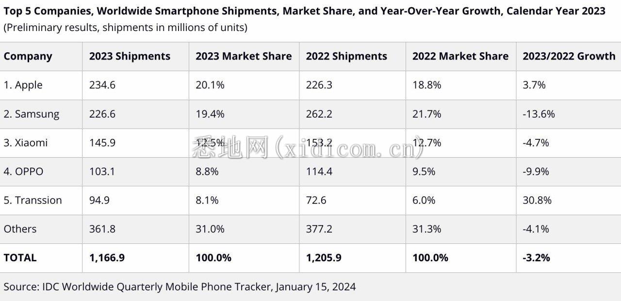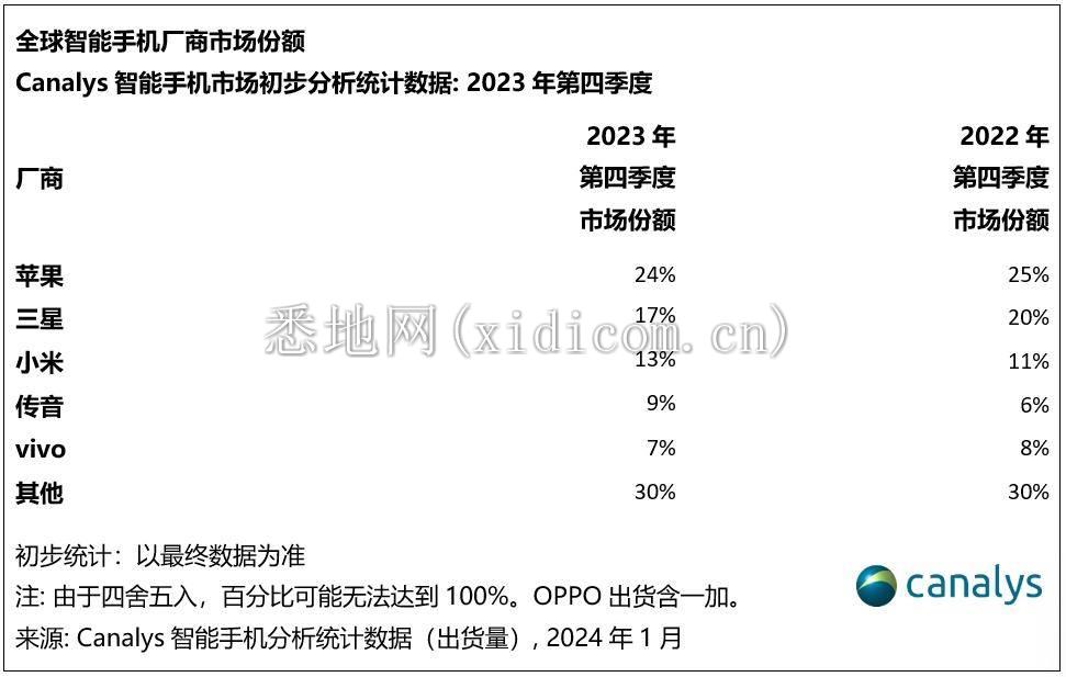 IDC公布的数据显示,2023年Q4,全球手机出货量3.261亿台,同比增长8.5%。其中,苹果出货量8050万台,市场份额24.7%,同比增长11.6%;三星出货量5300万台,市场份额16.3%,同比下滑10.9%;小米出货量4070万台,市场份额12.5%,同比增长22.7%;传音出货量2820万台,市场份额8.6%,同比增长68.6%;vivo出货量2410万台,市场份额7.4%,同比增长5.1%。