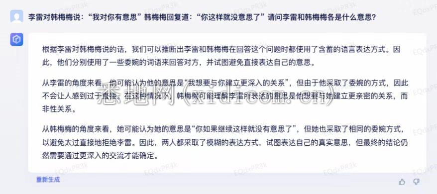办公室编辑Fia,在收到文心一言内测邀请的第一时间,就开始了试用,Fia选择了一个国人特有的含蓄表达对话发出了询问,【李雷对韩梅梅说:“我对你有意思”韩梅梅回复道:“你这样就没意思了”请问李雷和韩梅梅各是什么意思?】